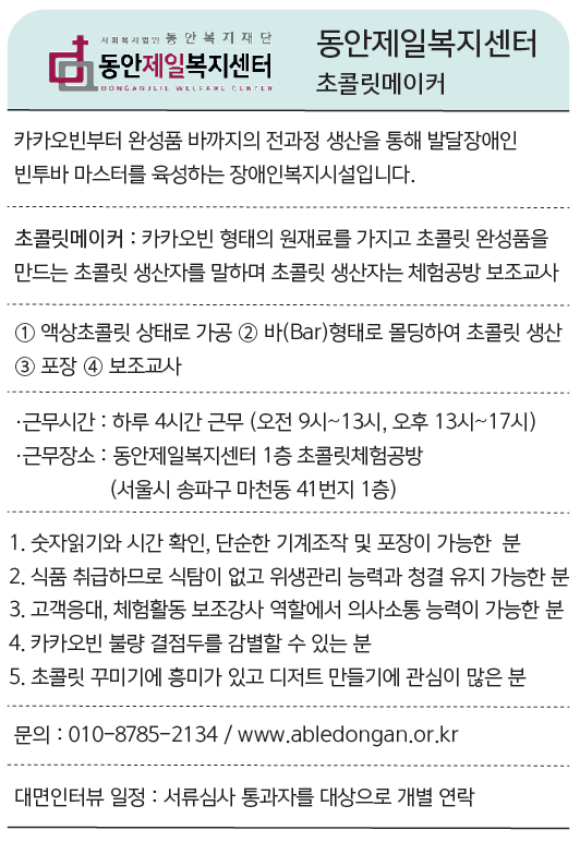 이런 재능을 가진 사람이 필요해요 1. 숫자읽기와 시간을 볼 줄 알고 단순한 기계조작 및 포장이 가능한 인지능력 및 소근육 능력이 필요합니다. 콘칭기’라는 맷돌기능을 하는 기계에 카카오닙스를 일정한 투입량과 시간을 체크하는 콘칭 작업에도 시간과 투입량 엄수하는 장애인의 특성을 활용할 수 있고, 콘칭을 통해 액상초콜릿이 굳어 만들어진 커버쳐 초콜릿을 정해진 온도와 시간을 맞춰 초콜릿 결정상태를 조절하는 템퍼링(온도조절공정)에 장애인의 특성이 강점으로 활용될 수 있습니다. ‘전자식 온도계와 전자레인지 가열도구’를 가지고 정확하게 온도를 재면서 초콜릿을 다루는 직무는 숙련과정이 필요한데 반복훈련을 통해 습득되기만 하면 비장애인에 비해 장애인에게 더 경쟁력 있는 직무가 될 것입니다. 2. 식품을 취급하므로 식탐이 없고 위생관리 능력과 청결을 유지할 수 있어야 해요 위생교육을 통해 스스로 청결유지와 위생관리가 가능하고, 재료와 완성품을 보관할 줄 알아야 하므로 식탐이 있어서는 안됩니다.